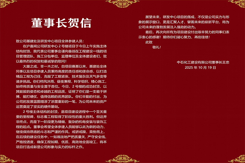 董事長王忠特從上海發(fā)來賀信,向奮戰(zhàn)在工程建設一線的項目管理團隊、監(jiān)理單位、分包單位及全體建設者,致以祝賀和慰問。研發(fā)中心項目承載著企業(yè)轉(zhuǎn)型升級、資產(chǎn)優(yōu)化的期望,希望全體參建人員能夠以此為新的動力,繼續(xù)保持精益求精的工匠精神和科學嚴謹?shù)墓芾響B(tài)度,乘勢而上,在后續(xù)的建設任務中,一如既往地嚴把質(zhì)量關、嚴守安全線,確保工程如期、優(yōu)質(zhì)、高效地全面竣工,將本項目打造成彰顯公司形象與實力的標桿之作。